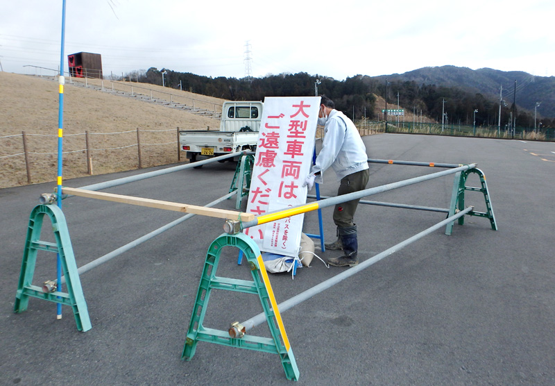 宇治田原町の「西ノ山展望広場」駐車場に18日、「大型車両はご遠慮ください」という看板が立てられた。