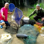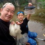 そんなお二人に応えるべく、ナガレカマツカの京都府での公式記録公表を託す林博之先生(写真⑥右)共々、あらゆる漁具を揃えて捕獲確認に挑み、ジュニアメンバーを伴って宇治田原町などにも探索の範囲を広げています。(写真⑦) 8月16日になってようやく念願の雌雄の採集に成功しましたが、その間の文献資料検索の過程に於いて、新種登録の研究者が先のイケチョウガイの所有者・木下富美さんのお孫さんの富永浩史さんであることが分かり、何という巡り合わせと驚きました。兵庫県在住の自慢のお孫さんの著書もいただいていた今年卒寿を迎えられる元気なおばあさんに、実に15年ぶりに引き合わせてくれたナガレカマツカでした。(写真⑧) 以下次号