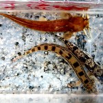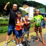 そうした7月の23日、ジュニアメンバー・松井優樹君(写真①右)との探査でようやくカマツカを捕獲することができ、林先生によってナガレカマツカであろうとのお墨付きをいただきました。和束町のお宝生物に、林先生とゆかりのアカザ(写真②上)とスジシマドジョウ(同下)に次いで、新種の淡水魚・ナガレカマツカ(同右)が加わりました。