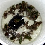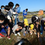 こうした少年期の感動体験からの想いが脈々と重ね書きされた自分史の一頁をひもといて、感性豊かな子供たちに紹介することで夢を与えるきっかけとなれば幸いと考えています。そんな啓蒙活動の実践のひとつが教育現場での環境学習授業で、母校の城陽市立富野小学校・生き物クラブの指導はもう10年余り続けています。待ちに待ったクラブ活動再開の10月20日、野外観察ではハリガネムシ出現を期待したカマキリ芸は不発でしたが、希少な水棲昆虫のコオイムシを捕獲確認できて面目躍如です。(写真①)