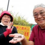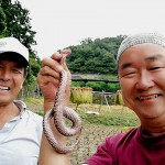 10月4日の日曜日には、相次ぐヘビの情報にナガレカマツカの新生息地調査とカメ調査を中断して引取りに駆け付けました。宇治・白川の田んぼに出た赤マムシと記念撮影の小島佳剛さん(写真⑥左)は、これまでにも珍蛇情報でもお世話になっている生き物に造詣が深いナチュラリストの協力者です。かたや城陽環境PS会議の野鳥仲間・嶋田節子さん(写真⑦左)は大のヘビ嫌いながらも、この日「五里五里の丘木津川運動公園」で見つかった謎のヘビを確保して待っていてくれました。