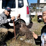10月24日の土曜日の夜、アライグマ2匹が捕獲罠にかかり、役所の引取りが週明けで何とかならないかとの連絡が入りました。畑ならともかく、敷地内に犬の餌の被害対策で設置したもので、暴れて威嚇し、糞尿の臭いのする罠の放置は困りものです。水没させるなど、自己処分される農家の方もおられますが、記録として残してやることが人間の身勝手で外来生物にされたアライグマたちへの償いとなるでしょう。かくして、井手町猟友会会長・梅本信昭さん宅に届けて処置をお願いしました。(写真⑪)