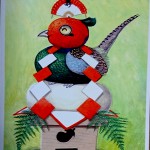 先ずはお正月にふさわしい、その名も富士鷹なすびさんの野鳥絵はがき・1月のキジをご覧下さい。(写真①) ユーモアバードで知られる自慢の鳥友に、今回は「城陽環境パートナーシップ会議」のロゴマーク・カエルのイラストをお願いし、早速、実用的なエコバッグ(写真②)を作成して城陽市内の全小学校4・5年生の環境学習授業で配布されました。そんな限定お宝グッズを、2月14日に今年初めて開催されるPS会議の公式イベント「古川自然観察会」の参加申し込み者への進呈も検討されていますので期待しましょう。