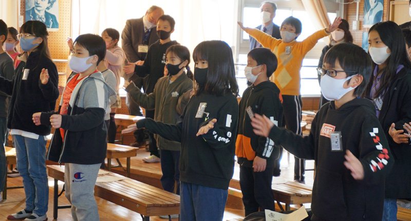 音楽の楽しさや楽器の仕組み、音色などを児童に知ってもらおう―と、学校から希望を聞き取り、企画を練った学生は当日も、マスク、マウスシールドなどを着用して感染防止に気を配りながらプログラムを進めた。音楽室に集まった児童たちも歌うのを控え、ボディアクションで様々なリズムに応えた。