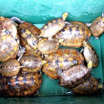 外来亀の代表種・ミシシッピアカミミガメは、環境省も危機的状況と駆除を奨励していますが、近年になって外来種と判明したクサガメでは、積極的な駆除には至っていません。現在、生息環境の悪化とアカミミガメの駆逐によって急激に生息数を減らしているニホンイシガメにとって、クサガメとの交雑によるDNA汚染が問題になっています。2009年5月4日には、ひと朝に14匹のイシガメを捕獲して標識放流しています。(写真⑥) 以後、急激に個体数を減らし、近年は研究者の協力要請にも十分に応えられずにいます。