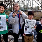 今年もお正月から古川にカメ罠を仕掛けて、希少なイシガメをゲットした松井優樹君(写真⑦右2)と、河川工事で生息環境が悪化する古川のイシガメを保護飼育し、繁殖させて稚亀を放流するプロジェクトを企画し、お父さんに繁殖池を造ってもらって今年からの本格始動も、やはりコロナの不安がつきまとっています。昨年は新種登録されたナガレカマツカを一緒に発見した優樹君は、小学3年生で「日本爬虫両棲類学会大会」の研究発表に名を連ねた期待のジュニアメンバーです。おなじく昨年のコウノトリ・ひかりちゃんが縁で仲間入りした中学生の福井惇一君(同左)は、熱心な野鳥観察で貴重な発見も相次ぐラッキーボーイで、鳥類学者・脇坂英弥君の後継者として期待されています。この日は京田辺市の神社で飛べずにいたツグミを保護し、安全な場所に放鳥しました。