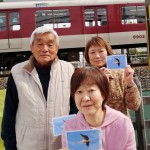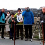 ひかりちゃんが伴侶を得て、かの地で繁殖するのもそう遠くはないでしょう。城陽の地が、一過性の羽休めの通過場所ではないことを教えてくれたひかりちゃんに続いて、毎年コウノトリの飛来で賑わうふるさとであって欲しいと願っています。郷土の自然財産である希少野生生物たちの保護を考える機会となったコウノトリ報道はまた、懐かしいナチュラリスト仲間との再会を演出してくれました。30数年来の「カモシカの会」の仲間・斎藤文美さん(写真⑨右)と菅谷幸子さん(同中)の来訪を受けるも、ひと足違いで飛び去ったひかりちゃんの絵ハガキを奥田睦和さんから進呈され、ゆかりの電波塔を背景に記念撮影です。