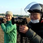今回のコウノトリの第一発見者・呉松暁美さん(写真③左2)に、和泉悟さん(同右)たちあらたな調査メンバーの参加を得て、脇坂英弥君(同右2)共々コウノトリ滞在記録の情報収集に努めました。欠かせない記録写真は、今年もネイチャーカメラマンの田中義則さん(同中)に西尾長太郎さん(写真④右)、田部富男さんと奥田睦和さんが担当で、本紙でも紹介された新規確認個体と2羽のコウノトリ飛翔写真の撮影で期待に応えてくれています。