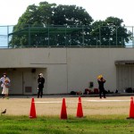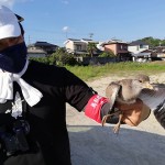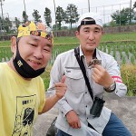 孵化雛の移動という最大の課題がいとも簡単にクリアでき、藤原幹郎校長先生(写真⑨左)に笑顔の報告です。記録写真担当の田中義則さん(写真⑩右)も、本来の生息環境で子育てする東角小学校生まれのケリたちを写真に収められ、現認者の面目躍如です。そんな最中に『ボクを忘れないで!』とばかりに鳴き出した放棄卵の奇跡も、子供たちと共に見守っていただいた先生方に卵の中から『ありがとう』のコールで記録写真の撮影です。(写真⑩)