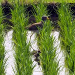 そして迎えた3羽の雛鳥が孵化したのを確認した6月20日、この日が日曜日だったため、東角小学校の校長先生宛にファックスで状況説明し、翌早朝に出向いて雛鳥を安全な隣接農地に移す算段を伝えました。果たして、月曜日に駆け付けるや先生方から『ケリはどちらに移されたのですか?』と、まさかの展開に少々慌てました。予想では、グラウンドの端っこの姿を隠せる草の中などに身を潜めて危険回避しているものと思っていましたが、既にフェンスの隙間から1・5㍍もの段差を越え、西側の水田に移動しているのを子供たちに教えてもらいました。(写真⑦⑧田中義則氏撮影)
