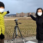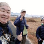筆者にとって福島の一番のご利益は、こうした記録写真の提供者・田中義則さん(写真②左)と、昨シーズンに真っ先に城陽環境PS会議の事務局にコウノトリ飛来の報告をいただいた呉松暁美さん(同右)たち愛鳥家の人たちとの出会いでした。今ではフィールド仲間として、コウライアイサの観察やシラコバト探査にも同行し、昨年には城陽市のお宝生物・アズキガイ調査の現認などナチュラリストの活動のサポートをいただいています。