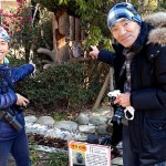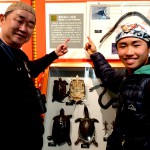 多摩動物公園から贈られたばかりのコウノトリを覗き見て、ふくろうの森の住人たちを被写体に楽しんでもらいました。(写真⑩) 博物館自慢の3D大画面の科学ムービーを堪能し、フィールド調査に役立つ展示資料に学ぶ福井君に、筆者が発見した爬虫類の間違い表記にロックオンしての記念撮影です。(写真⑪) 年齢差60歳の相棒たちと、ナチュラリストのライフスタイルを押付けた休日の一日フル稼働で、明日のフィールド活動への精気を充填してきました。
