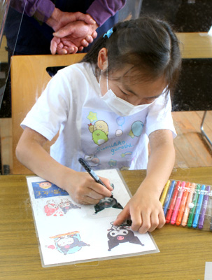 この日集まったのは、1・3・5年生の7人。アニメのキャラクターなど、好きな絵をカラーペンで専用のフィルムに丁寧に描き写し、色を塗った。オーブントースターで焼くと、自分だけのプラ板が出来上がった。オリジナルの絵を描いた児童もあった。