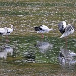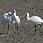 前回に紹介した宇治川のコウライアイサと滋賀県のカナダヅルは、コウノトリと同じく国際的な希少鳥類であることに変わりはありませんが、日本には稀に飛来する迷鳥で絶対数で大きな隔たりがあります。そしてやはり極まれな大珍鳥の情報、ヘラサギとクロツラヘラサギ(写真⑨山中十郎氏撮影)飛来の記録も11月半ばに飛び込んできました。