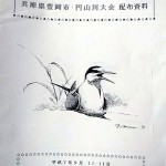 かの地は1995年に「日本鳥類標識協会大会」が開催された所で、野鳥に環境省の標識足環を装着し、渡りのルートや寿命・つがい構成など保護に不可欠な生態解明の研究に携わる学術会議で、筆者は後に山階鳥類研究所でも採用された野鳥の繁殖に影響なく安全に捕獲できる罠を考案してビデオ映像と共に発表した懐かしい思い出がよみがえります。当時は野生復帰など夢物語と思われたケージ内のコウノトリの子孫たちを、四半世紀を経て野外観察できたことは至上の歓びです。研究発表の配布資料(写真③)のイラスト・コアジサシは、野鳥画家の箕輪義隆さんから提供いただいたもので、大会のシンボル鳥として描かれたコウノトリの原画(写真④)もいただき今や我が家の家宝となっています。