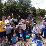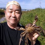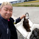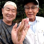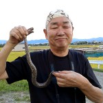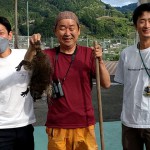 その前日、準備のためにカメ罠などの漁具を仕掛けに行ったところ、アライグマがヨシ原に潜んでいるのを見つけました。外来生物駆除を旗印に狩猟免許を取得したナチュラリストハンター、大立ち回りの末に網での捕獲に成功し、和束小学校の長村先生・赤司先生に報告です。(写真⑬) その後は猟友会会長宅に届けて…ラスカル鍋に!? そんなハンター仲間たちも自然観察会のサポートやスッポン漁の相棒となっています。10月の南山城村自然観察会には、10人ものサポート参加があり、60㌢を超える個体もいるというシーボルトミミズを手に記念撮影は京都市から参加の青木さんです。(写真⑭⑮)