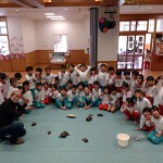 アニマルニュースのトップは、福井惇一君たちと和束町で発見した絶滅寸前種・ユビナガコウモリ(写真➀)です。その同じ隧道で標本用に採集したオオゲジゲジ(写真②)と、宇治田原町の倉谷勝巳さんが採取されたヤマナメクジ(写真③)や中村勝之さんが捕獲されたシマヘビ共々子供たちの生き物教室に持参し、大いなる歓迎を受けています。後期から復活した城陽市立富野小学校の生き物クラブの指導には、定番のカメにスッポン、ヘビの他、駆除するヌートリアの屍も持ち込んで披露しています。(写真④⑤⑥) 感性豊かな子供たちが、こうした生きた教材とのふれあい体験で様々なことを学んで成長してくれることを願っています。