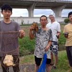 また、新種の淡水魚・ナガレカマツカの発見が自慢の和束川の野外実習授業では、今年も和束小学校4年生たちとカジカガエルの鳴き声を確認し、絶滅寸前種のスジシマドジョウにサワガニやイモリなど、他では見られない生き物たちを捕獲確認しています。(写真⑫)
