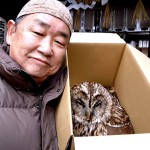 お手柄の中野響君(写真⑤左)は、筆者が指導する城陽市立富野小学校「生き物クラブ」出身の鳥少年で、福井惇一君(同中)と千田真大君(同右)共々後継者として期待のジュニアメンバーです。2月4日の城陽環境PS会議主催の古川野鳥観察会では、堂々の講師を勤めてくれます。同じく代表講師の田中義則さん(写真⑥中)には、鴨猟の現場にも同行し、この日の獲物のカワウをお借りして里の西保育園の園児たちへ披露のサプライズや、保護委託されたフクロウの記録撮影などでお手伝いいただく欠かせない相棒となっています。(写真⑦)