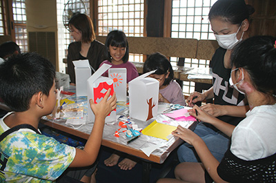 正行寺では、午後1時から本堂で「おつとめ」が行われ、事前申し込みした地元の小学生ら約40人が2部制で手作り灯籠のワークショップに挑戦。お寺で用意したキットを使って、児童たちは高さ20㌢、幅・奥行10㌢の手作り灯籠を作り上げ、星など様々な模様の切り絵を周囲に張り付けて完成させた。