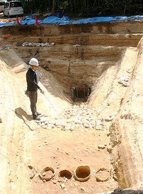 久津川車塚古墳の史跡公園整備に向けた市教委の発掘調査は、2014年度から始まり、今年度で節目の10年目。市史跡整備委員会委員の岸本教授と同じく考古学が専門の長友朋子教授(立命館大学)の指導のもと、学生有志らの協力を得て8月17日に開始し、昨年度に続き、JR奈良線東側で4カ所トレンチ(発掘)した。調査期間は10月6日まで。