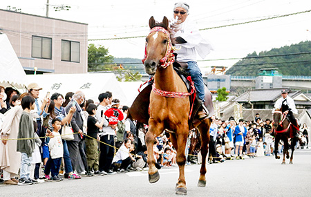 4年前には無かった新名神高速道路の高架橋が望める郷之口の御旅所前沿道で大勢の人々が熱い視線を注ぐ中、2頭の神馬が颯爽と風を切った。