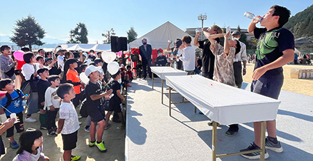 コロナ禍を経て4年ぶりのステージには、うぐいす幼稚園マーチングバンド、立命館宇治高校チアリーダー部、ダンスサークル1000+、宇治田原郷「茶音頭」伝承会、No・va・Maro(ウクレレ弾き語り)、宇治田原バレエ&ダンススクールが登場。復活したラムネの早飲み競争も大いに盛り上がった。
