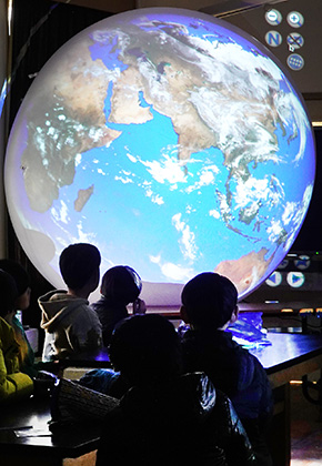 また、第2プログラムでは「タジックアース」と呼ばれる球形スクリーン・システムを活用。そこに投影される惑星や地球を鑑賞し、ipadを使って惑星の動きも操作した。