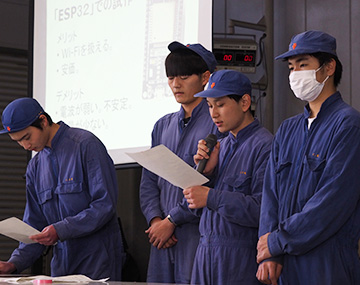 同校工場棟で23日に行われた自動車科(竹本尚人科長)の年度を締めくくる課題研究発表会で、檻の制作に取り組む自動車科3年生(大森慈雨・小嶋温人・妻神煌可・佐賀零樹・勝賀野空・勝田陽太・諏訪大樹の7人)が電気技術科と連携するこれまでの努力の成果を報告。
