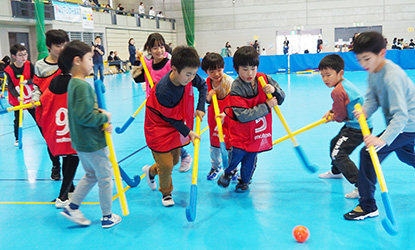 東京五輪日本代表チームの田中健太さんをはじめ、インドアホッケー日本代表選手6人(男・女各3人)をゲストに迎え、子供たちに分かりやすく手ほどきした。