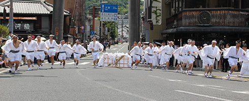 本町通りを経て、再び県神社へ。気温30度近くになる暑さの中、幣差(へいさし)と呼ばれる若衆たちが、街中の厄を封じ込めた「大幣」を引きずって疾走。「ワッショイ」の掛け声をあげて宇治橋に到着すると、橋の上から大幣を川へと投げ込んだ。