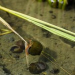 ジャンボタニシと呼ばれる南米原産のスクミリンゴガイは、1980年代に宇治市で養殖されていましたが、食文化として定着せず廃業に至って放置されたものが、隣接する巨椋池干拓田の水路で大繁殖しました。当時から稲を喰い荒らすとして和歌山県や静岡県で問題になっていましたが、当地では田植え時期が遅く、水路には餌となる水草が豊富で水田への侵入も少なくさしたる被害はありませんでした。それでも水路の駆除活動は続けられ、1990年初頭の地方紙には舟いっぱいのジャンボタニシと直径13cmもの大物捕獲の記事が掲載されています。現在、南山城地方全域に広く分布するジャンボタニシの侵入経路では、巨椋池干拓田から各地に出荷された田植えの苗床の稲に稚貝がまぎれたものとされています。植物の茎や側溝などに派手なピンクの卵塊を産み付けますが、毒性があり駆除の際には注意が必要です。
