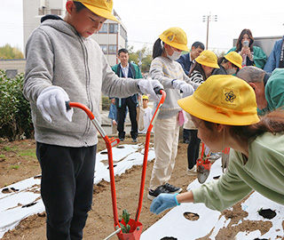 式典では、集まった児童84人を前に、松村淳子市長が「皆さんと同様、茶の木がすくすくと育ちますように」と挨拶。記念撮影に続いて、児童がグループになり茶園へ繰り出した。先がスコップ状になった苗植え機を慎重に操作し、植えた苗に土をかぶせていった。