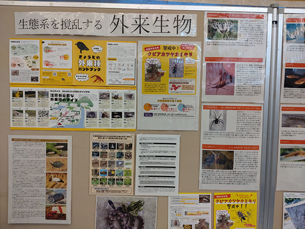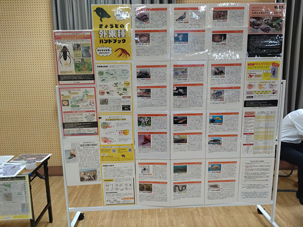 当洛タイ新報と共にいち早く特集記事の掲載で協力頂いた京都民報に、わざわざ大阪府の高槻市まで二回にわたって現地取材を頂きクビアカツヤカミキリの危険性を報道頂いた京都新聞など、衆人の目を経たマスコミ報道記事は公的意義を有する文献資料として後世に残る記録です。こうした資料と最新の生き物ガイドブック・外来生物編などを掲示し、クビアカツヤカミキリの活動最盛期でもある6月28日、京都府総合政策環境部自然環境保全課の河村勇輝氏を迎えて、「クビアカツヤカミキリの被害を食い止めるために」と題したご講演を頂き、詳細な資料と写真に標本を前に、参加者一同『今そこにある危機』を実感し、あらためて侵略的外来生物の侵入阻止と根絶への願いを募らせました。(写真⑪⑫⑬⑭)