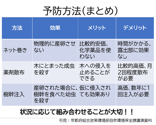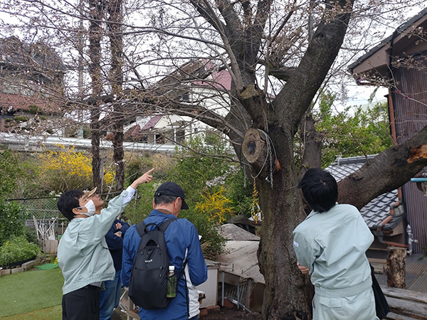 さて、一昨年来のTVニュースで関東各所において猛威を奮うクビアカツヤカミキリの存在を知り、関西でも大阪府や奈良県など隣接府県で発見され、桜の木などに産卵して枯死させる外来昆虫の侵入に備えての対策を緊急の課題として取り組みました。京都府でもクビアカツヤカミキリの講習会が開催され、その生態や被害の実態を学び、被害木の判定に伐採や防御ネットなどの対処にまで及びましたが、個人には荷の重い難題が山積していました。(写真⑤⑥⑦)