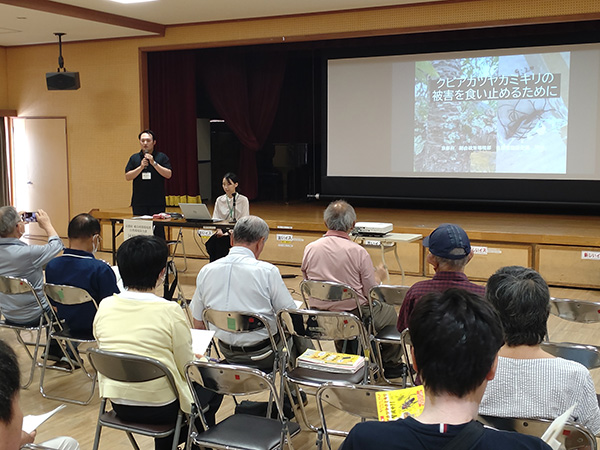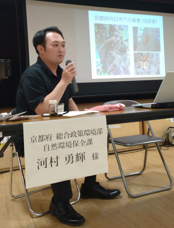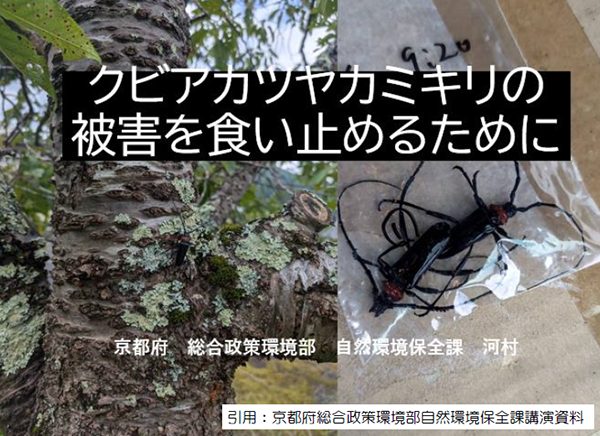 今回の研修会は、城陽環境パートナーシップ会議の年度総会に引き続いてのフォーラムとして開催されましたが、総会の冒頭で4月に亡くなられた芦原昇・副会長を偲んでの黙とうでその功績に感謝しご冥福をお祈りしました。芦原さんは筆者の想いにも応えて、クビアカツヤカミキリ対策の最前線で活動されている大阪府高槻市役所担当部署への視察にも同行頂き、会長を務められていた「宇治田原町エコパートナーシップ」でも警告資料の配布や現地調査にも取り組んで頂いていました。