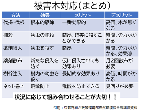 クビアカツヤカミキリの及ぼす被害木が、令和6年度末時点で自治体が把握できているだけで奈良県・和歌山県で約三千本に八千本、大阪府では約1万本に及びます。京都府でも昨年7月に西京区と向日市で相次いで見つかり、8月には福知山市でかなり深刻な状況でクビアカツヤカミキリノの侵入が判明しました。予防方法として薬剤やネット巻きの効果が紹介されましたが、その諸経費の問題も気になるところです。もし侵入されてしまったら、成虫や幼虫を見つけ次第捕殺することと、被害木の伐採など拡散防止の手段を講じることとなり、地権者や関係者にとっては大変な事態を迎えることとなります。(写真⑮⑯)