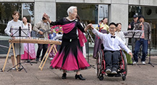 このほか、「プラネタリウム」では、文パルの指定管理者・公益財団法人城陽市民余暇活動センター(井関守理事長)と京都大学のコラボ企画「とさなおこのサウンド・オブ・いけばな」が入場無料で公開。文パル屋外では国内姉妹都市・鳥取県三朝町の「足湯コーナー」や「特産ナシ」の販売、地元事業所・団体・行政・キッチンカーなど43ブースがテントを並べ、人気の飲食店等には、来場者による長蛇の列もできた。