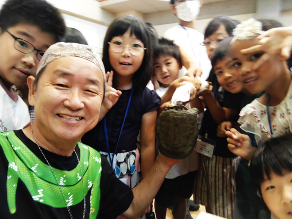 さて、それぞれ学校近くの実習地に前日からモンドリの罠を仕掛け、網も人数分を揃えて、投網漁を披露しての獲物は毎回子どもたちの大きな歓声を届けてくれます。彼らの輝く眼が勲章で、これらの活動記録が何よりの財産でナチュラリストのモチベーションとなっています。(写真⑪~⑭)