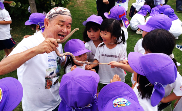 かたやカメの観察に、カエルやザリガニなどの採集から川に入っての魚捕りなど、保護と愛護を取り違えた人たちからの苦情もない現在の総合的な観察会スタイルとなっています。また、近年の傾向として、学校教育の現場においては、個人が特定できる写真の掲載は原則NGで、ヘビを持参するのも苦手な子への影響を考えて控えています。その分、サイエンスキッズたちとの交流や、生き物担当で指導に赴く「里の西保育園」の園児たちは、ヘビへの先入観もなく、興味深い生き物として直ぐに受け入れてくれ、こちらが癒されています。(写真①~③)