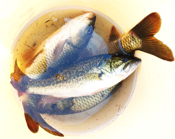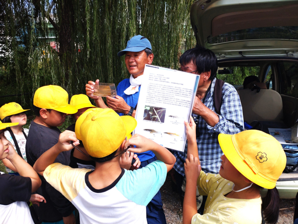 対して、教育現場の環境学習指導などは平日イベントの利点があるものの、野外実習授業では独りでの対応が困難な場合も多々あり、協力者の人材確保の課題があります。城陽市の今池川と下流部の古川流域は、「城陽環境パートナーシップ会議」が主催する冬期の野鳥観察と初夏の水生生物の観察会フィールドとして知られていますが、近隣小中学校の野外実習授業の地としての歴史もあります。今年も10月14日に富野小学校の3年生たちと野鳥や昆虫、植物観察と共にカメや魚捕りを楽しみました。メダカやドジョウの他、ドンコにカマツカ、外来生物のタウナギとカダヤシなどを捕獲し、身近にもたくさんの生き物たちが生息していることを学んでくれたことでしょう。事前の室内授業はスッポンなど生きた教材を持参しての独壇場でしたが、野外実習当日はナチュラリスト仲間3人が駆け付けてくれ、それぞれ野鳥や淡水魚など専門分野の指導を担当し充実の実習授業を行うことができました。