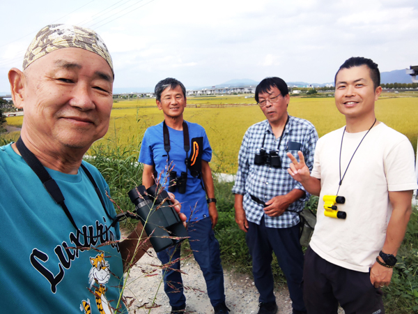 鳥班担当の岡井勇樹君(写真⑦右)は、自身が小学校3年生の時に父さんに連れられて筆者の野鳥観察会に参加したのがきっかけで、鳥類標識調査にも同行して「日本鳥類保護連盟」から「子ども鳥博士」に認定された最適な講師で、有休をとって駆け付けてくれました。滋賀県大津市から駆け付けてくれた秋井信幸さん(写真⑦右2)は、40年来の鳥仲間でバードカービング作家です。2年前の環境フォーラムで展示頂き、11月に奈良市での作品展にも駆け付けています。魚班担当の竹野功璽さん(写真⑦左2)とも鳥友ですが、琵琶湖博物館で「日本一珍しい淡水魚」としてパネル解説があるタンゴスジシマドジョウの学名に関係している専門家で、自然観察会のメイン講師をお願いしています。