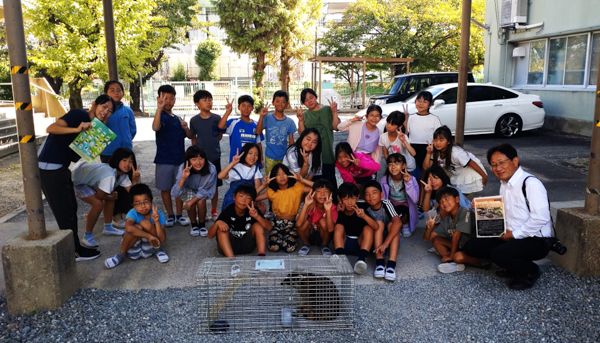 富野小学校の野外実習授業は、城陽市に生息する生き物たちを学んだ10月7日の室内授業の翌週14日に設定し、野鳥と昆虫に植物、魚とカメの4つグループに分けて学校から今池川まで、それぞれみんなで観察しながら歩きました。途中の公園では、国の花・桜の木の見分け方を学び、田んぼに残されたアライグマとイタチの足跡を確認しました。そして早速、昆虫班のリョウタ君がアカハネオンブバッタを捕獲し、2年前に当時の生き物クラブの堀井陽太君によって発見された城陽市初確認の外来生物と新聞にも載ったことを伝えています。そして魚班は、前日から仕掛けておいたカメ罠を引き揚げ、みんなで捕獲したカメの見分け方を学んでいよいよ川に入っての魚捕りです。今回はドンコなども捕れて上々の成果でした。(写真④~⑥)