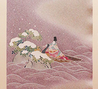 本友禅(手描き友禅)の作品は、東矢千嘉子作の帯や訪問着。東矢氏はライフワークとして、『源氏物語』54帖を着物と帯で表現している。このうち「浮舟」をテーマとした訪問着は、水しぶきや渦が描かれる。男女を描く帯と併せ、波乱の運命を暗示か。