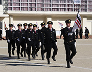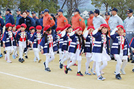 宇治田原町消防団の出初式は、同町住民グラウンドで行われ、各支部の団員、支援隊員らが凛々しい分列行進で入場した。