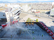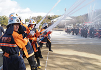 京田辺市消防出初式は、田辺公園多目的運動広場で行われ、ド迫力の一斉放水で災害に強いまちづくりをアピールした。