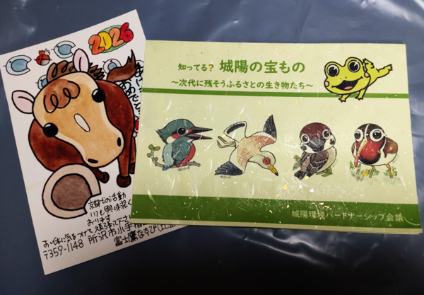 今年も富士鷹なすびさんから楽しい年賀状が届きました。(写真①) 城陽環境パートナーシップ会議の年間最大行事・城陽市環境フォーラムで、野鳥イラスト100点にも上る原画展を開催したのは2012年度のことでした。この年、日本鳥学会100周年の東大記念大会で、配布資料の表紙イラストを描いて頂いた富士鷹なすびさんと、脇坂英弥君に大植登先生・竹内康先生たちと「南山城鳥類目録」を演題に研究発表したことを思い出しています。鳥人ナチュラリスト復活の今年、富士鷹なすびさんのユーモアバードがイベントに華を添えてくれます。ご期待下さい。