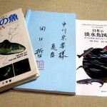 今回、水中写真家で絶滅種のクニマス発見で知られる田口哲先生(同左2)が、水鳥たちの水中写真を取り入れ、動画も見られる野鳥図鑑の出版を企画されていて、ナチュラリスト仲間の京都水族館元副館長の関慎太郎さんからの紹介を受けて協力の運びになりました。ともあれ、筆者も30年来活用してきた淡水魚の識別図鑑(写真②左)の著者で、9月17日に誠文堂新光社から出版されたばかりの「日本の淡水魚図鑑」をいただき、これを機会に今後の淡水魚調査のアドバイスを願えたらとナチュラリスト仲間との交流の場の設定となりました。