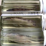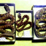 そして、フィールド探査と共にナチュラリストのライフワークとする啓蒙活動の幕開けが、9日に木津川市の交流会館で開催されたサイエンスキッズの研修会でした。この2年間、コロナ禍で活動の場が激減して凹むナチュラリストに、夏祭りの開催で元気をもらいました。今回もコロナ対策を厳重に、佐々木和也先生(写真⑤中)と内藤さかえ先生(同左)にお世話いただき、定番の「ふるさとの生き物たち」をテーマのパフォーマンスでは、タイガースバンダナに虎柄ファッションで、正月ネタの干支のトリビア・虎が深刻な絶滅の危機にある現状などを解説し、爬虫類冬眠期間は生きた教材に替わって珍蛇たちの貴重な標本が必携アイテムです。(写真⑥) そして、お隣の和束町で新種を発見したぞ!とナガレカマツカの標本(写真⑦)も披露し、ここで見つかったツキノワグマのホットな話題で盛り上がりました。